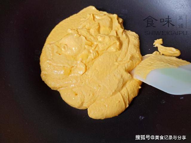 7、加入炒菜用量的油,五成热时,倒入蛋黄泥,开始翻炒,边炒边用铲子,继续碾压蛋黄,让它变得更细腻,随着温度升高,蛋黄会逐渐冒泡,呈现糊糊的状态。
