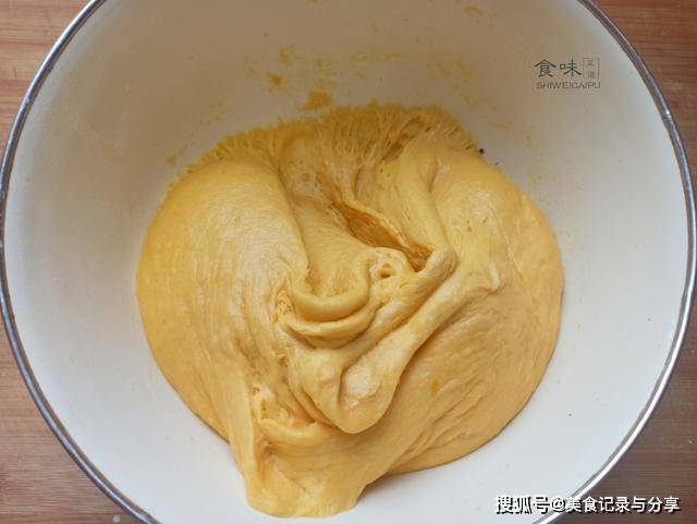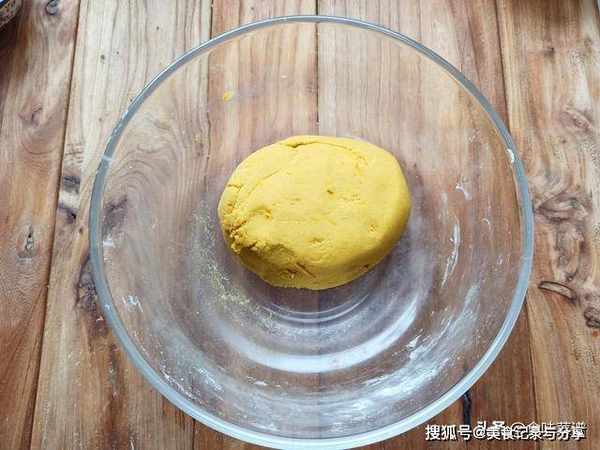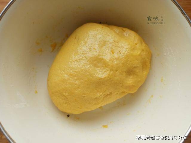 4、全程不需要加水,只用南瓜的湿度和蛋液即可,能达到面光、盆光、手光的状态即可,盖上一层保鲜膜,醒发一个小时。
