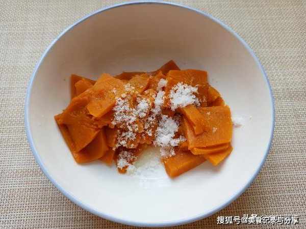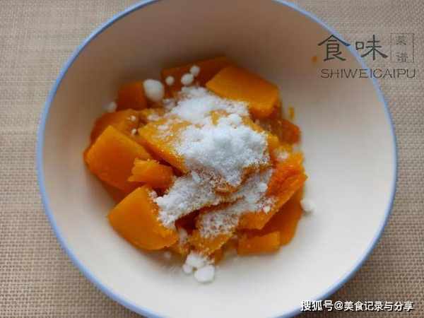 1、准备半块南瓜,除去外皮,切得越薄越好,这样容易蒸透,上锅大约10分钟,南瓜倒入碗中,喜甜的加点白糖,趁热捣成南瓜泥。