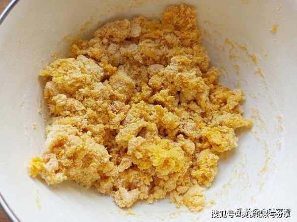 4、先搅拌成面絮状,需要注意的是,由于每个人的面粉吸水性不同,如果太干,需要适量添加水,看情况而定。