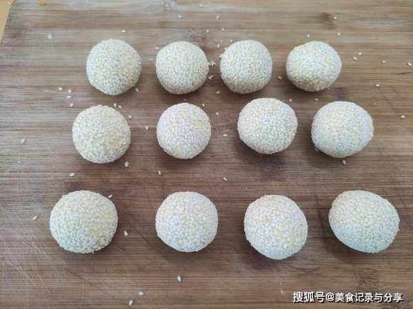 7、全部滚好后准备油炸,此时的芝麻容易掉落,可以用掌心适当地按压一下,让芝麻球更牢固。