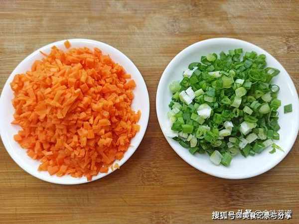 3、趁蒸南瓜的时间,切一些配菜,半根胡萝卜切成碎末,小葱切末。