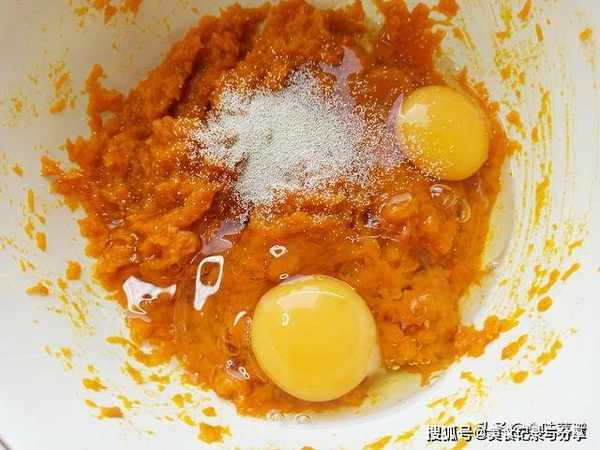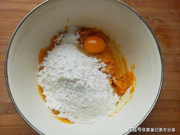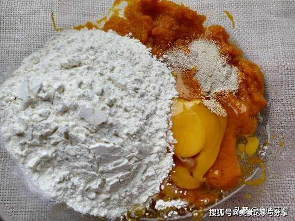 3、蒸熟以后的南瓜,倒入空碗中,用工具压成南瓜泥,等待几分钟温度降下来,加入3克酵母,打入1个鸡蛋,适量白糖,搅拌均匀后,倒入450克面粉,添加过程少量多次。