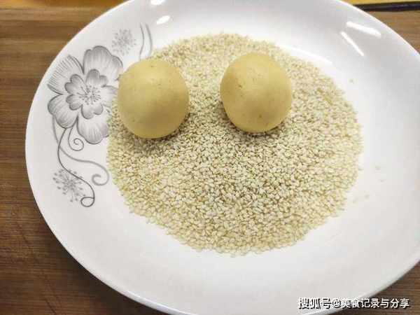 6、团好的南瓜球,放在白芝麻中,均匀的滚上一圈,目的就是为了让它沾满芝麻。