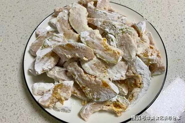 3、准备适量的玉米淀粉,将南瓜条依次裹满淀粉,边裹边拍打,保证没有多余的淀粉,裹厚一点也没关系,但别太夸张,这样炸出来南瓜不会轻易散开。