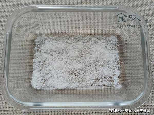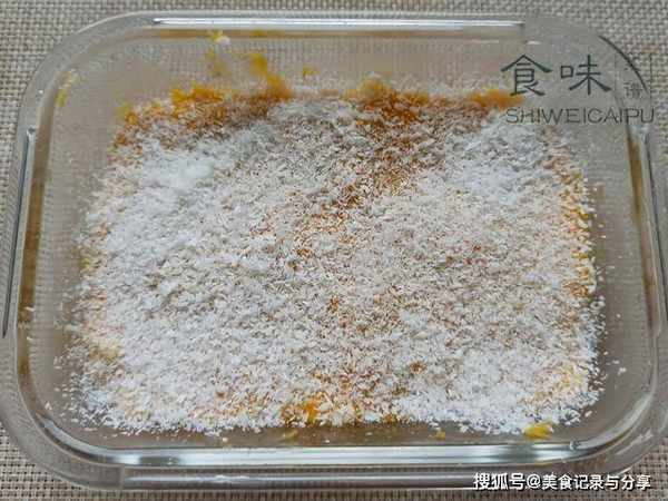 7、准备一个长方形容器,具体形状随意,但是要干净,无水无油,在底部铺上一层椰蓉,椰蓉都知道吧,一般超市都有卖的,就像面包糠一样的碎末。