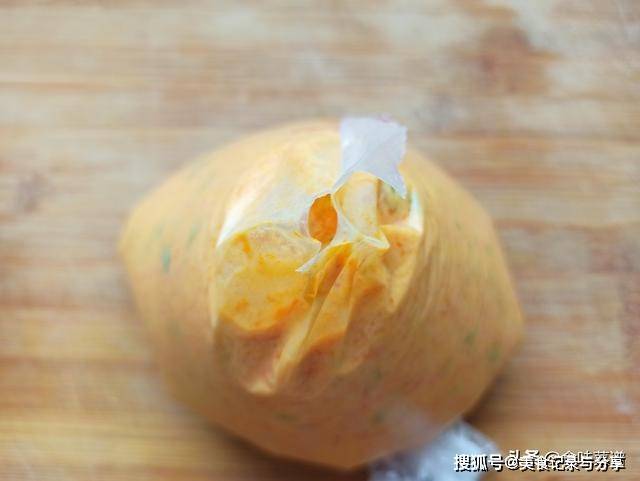 8、把南瓜面糊倒入一个干净的保鲜袋中,收口扎紧。