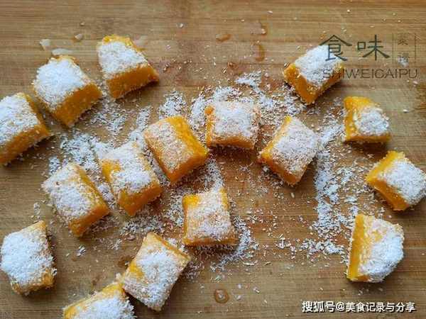 9、等时间到了,将南瓜泥倒出来,很容易就能脱模成功,先切成长条,再切成小块,这样方便食用,可以再撒点椰蓉,补充一下。