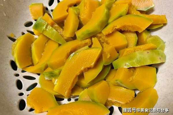 1、准备一个南瓜,其实老南瓜正好吃,刮掉外皮,清洗干净,改刀切成细片,起锅烧水,水开把南瓜倒进去,沸水煮上10秒钟左右,迅速捞出来。