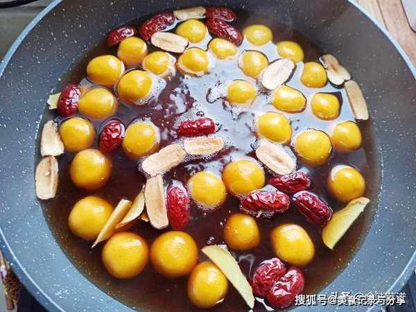 8、锅中烧开水,下入小圆球、姜片、红枣片、2勺红糖,继续煮一会儿,等待全部上浮。