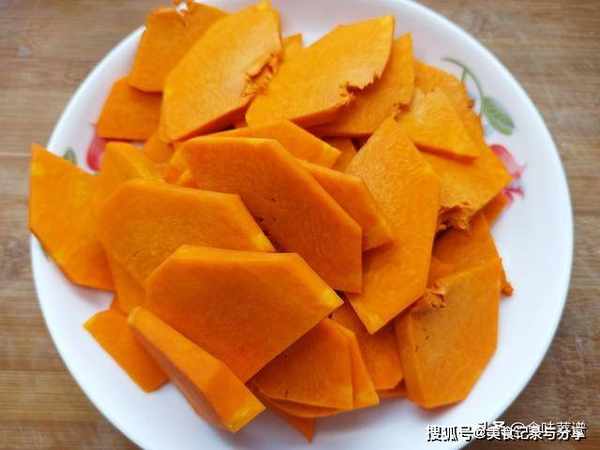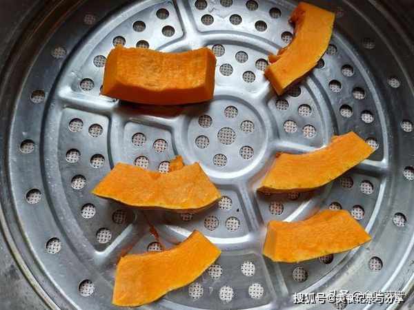 1、准备南瓜半个,去掉外皮后,切成薄片,越薄越容易蒸熟,开水上锅,把南瓜平铺均匀,中火蒸8分钟,能用筷子能轻松扎透即可。