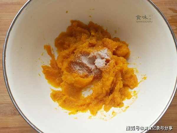 2、蒸好的南瓜倒入碗中,加入30克白糖,趁热捣成南瓜泥,其实南瓜糖分很足,不喜欢过甜的可以不放。