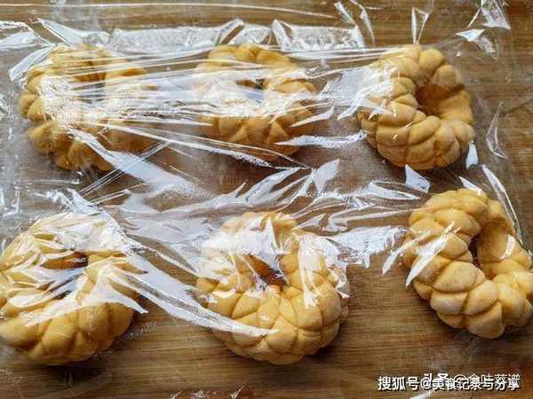 7、这一步要开始发酵了,全部做好以后,轻轻按压成小饼,盖上一层保鲜膜,饧发40分钟,等饼摸起来轻飘飘的即可。