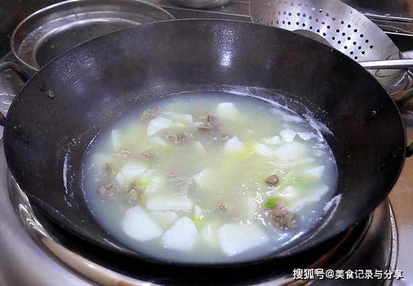 ,煮至水再次沸腾后打去锅中的浮沫,转为小火焖煮50分钟。50分钟以后把萝卜倒入锅中、稍微加一点食盐调味,盖上锅盖再焖煮2分钟。