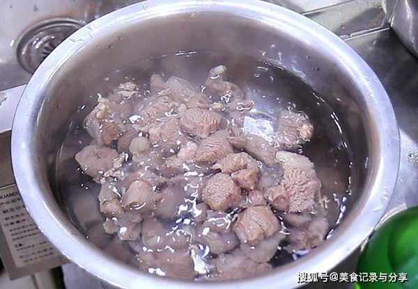 锅内烧水,羊肉冷水放入锅中,大火烧开以后打去锅中的浮沫,大约煮2分钟,把羊肉倒出来用清水洗干净备用。