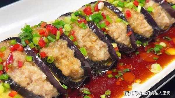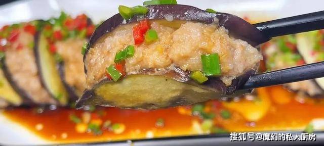 8.撒上一些青红椒丁、葱花,泼热油激发出香味,再淋上少许蒸鱼豉油,美味即成,酿茄盒这样做,肉质鲜嫩多汁,上桌抢着吃。