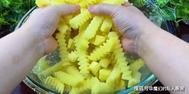 1.土豆洗净后,削去外皮,用波浪刀切成一条条。