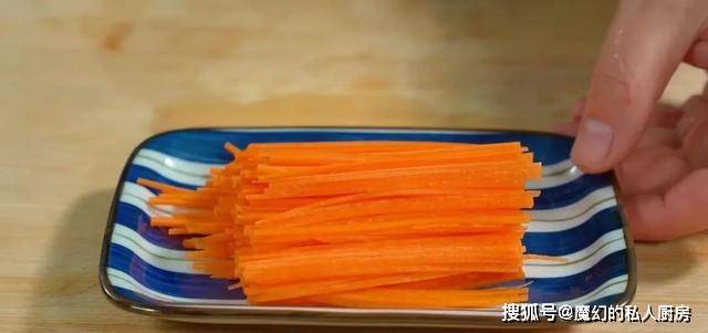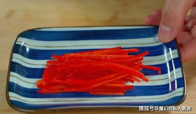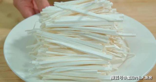 1.杏鲍菇洗净后,去头去尾,先切成薄片,再改刀切细丝。