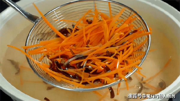 9.接着将木耳和胡萝卜也倒下去焯水,1分钟后控水捞出。