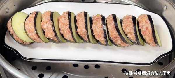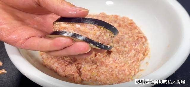 5.将肉馅酿入茄夹中,将边缘多余的肉馅刮平整。