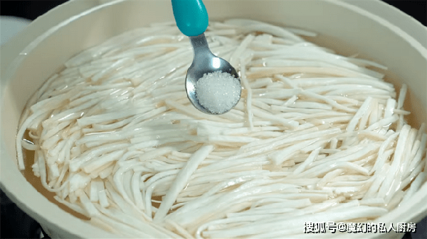 8.起锅烧水,水开倒入杏鲍菇焯水2分钟,捞出过凉。