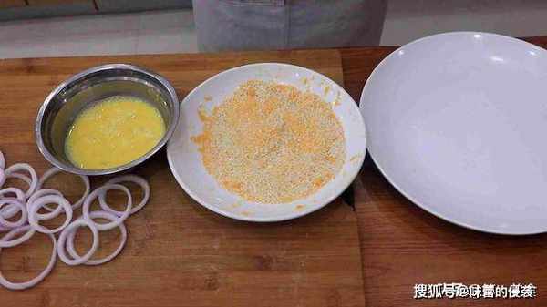 3.然后我们把洋葱圈先裹上蛋液,再沾一层面包糠,这样炸出来的洋葱圈色泽金黄,口感外酥里嫩。