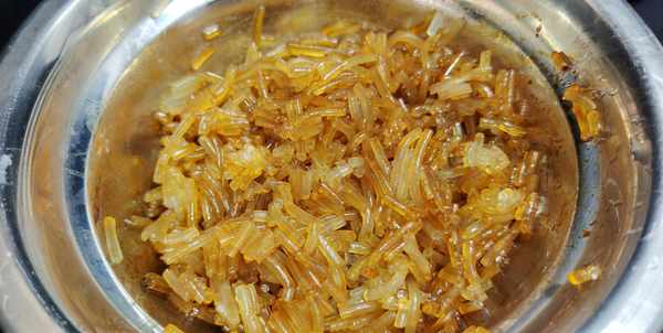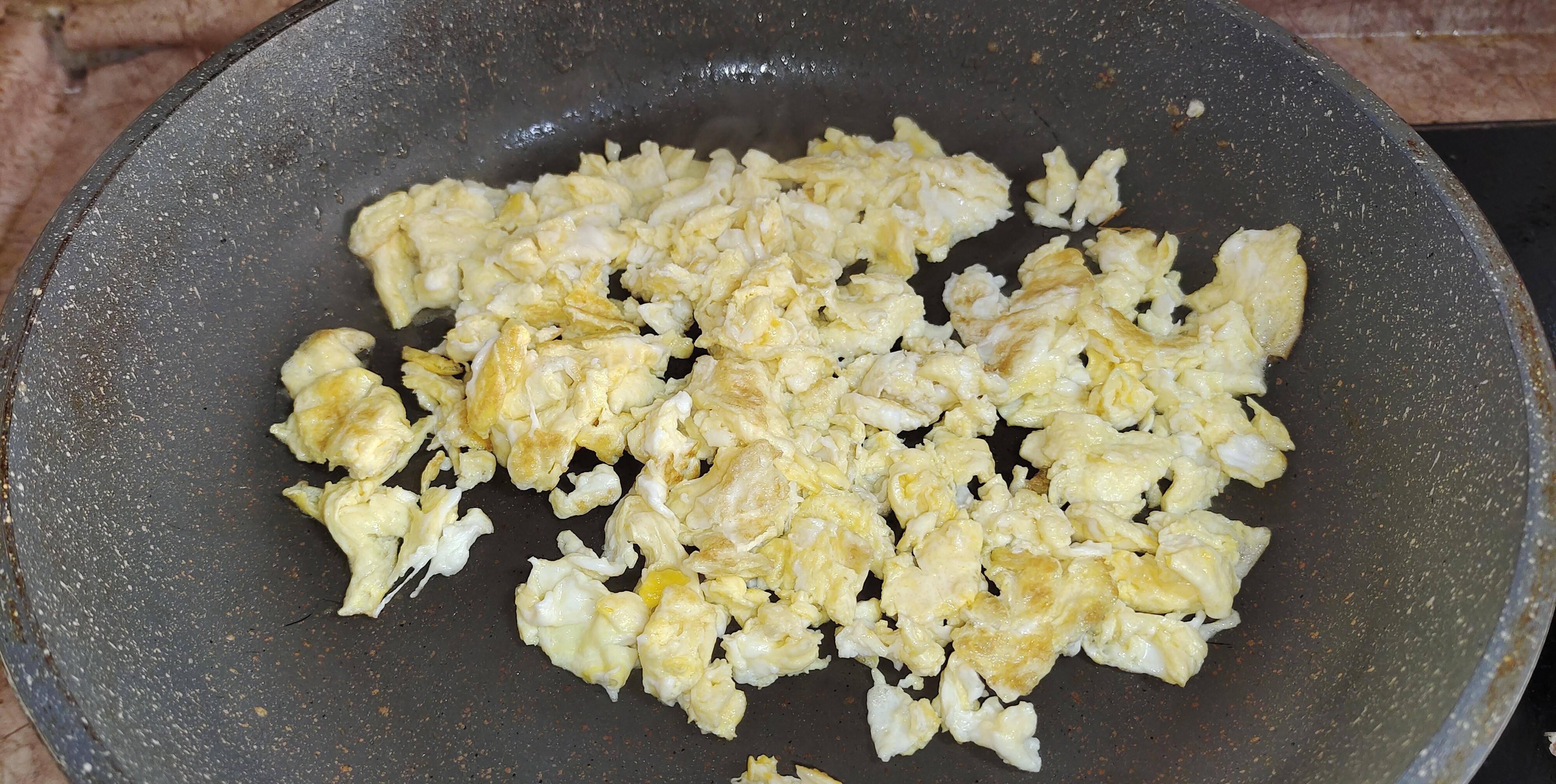 第三步:我们再准备鸡蛋3个打散后炒熟炒碎,准备干粉条一把放入开水中泡软再切碎,而后淋入芝麻油一汤匙,老抽少许拌匀备用,还有干木耳用温水泡发后切碎备用。