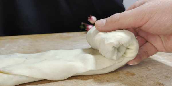 第六步:先上下两边先对折起来,而后用双手托起两头轻轻地抻长一点,而后从一头卷起来,边卷的时候可以一边拉长,收口处抹点水粘连好。最后稍微用力地压一压,整理规整即可开始上锅。