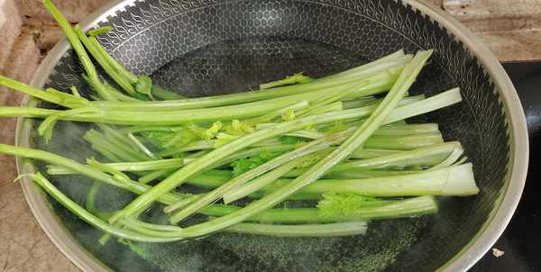 第二步:芹菜一把去掉叶子,芹菜叶子也不要丢弃,可以凉拌着吃。将芹菜杆清洗干净后开水下锅焯烫2分钟,捞出后用凉水冷却挤干水分,再切碎备用。