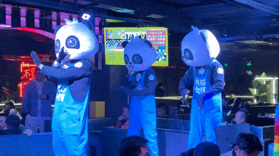 这次盛典正好赶上一位达人过生日,所以气氛由熊猫伙伴们的热情舞蹈直接拉到高潮,萌萌的熊猫玩偶人的舞蹈动作也十分呆萌可爱。