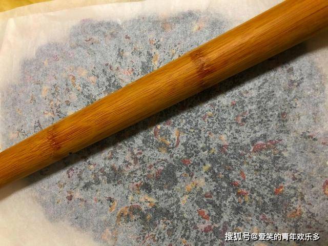 2、翻拌均匀以后,倒入垫有硅油纸的容器中,上面再铺一层硅油纸,用擀面杖开始压平,擀的时候,稍微用点力气,擀得越薄越好。