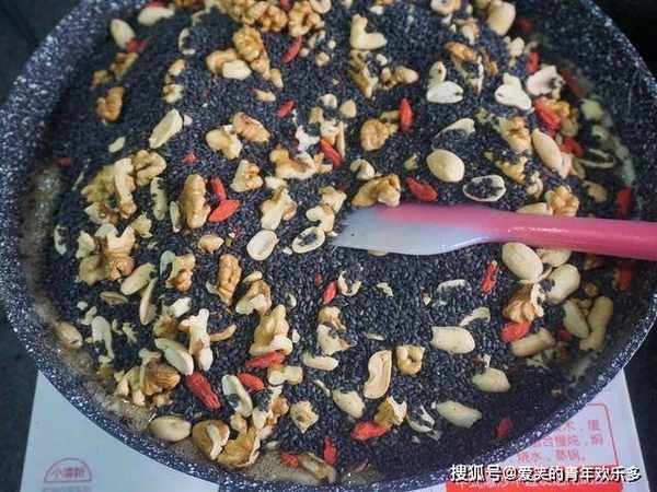 2、再准备食材,250克熟黑芝麻、150克红枣片、100克熟核桃仁、100克熟花生仁、30克枸杞,自己喜欢的干果就行,快速倒入锅内,开始搅动,动作要快,姿势要帅。