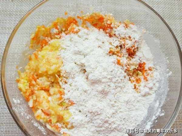 2、把粉好的蔬菜,倒入碗中,根据菜量的多少,打入1-2个鸡蛋,再舀半碗面粉,少量多次地添加,边倒边搅拌,直到面糊黏稠即可,放盐、蚝油、胡椒粉调味,搅拌均匀,即可下锅。