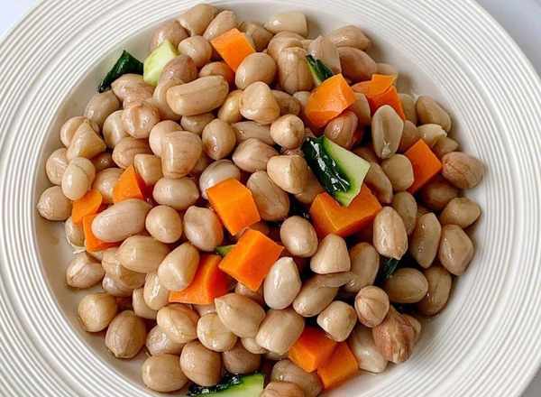 3、吃之前盛出花生米,加入黄瓜丁和焯水的胡萝卜丁+香油拌匀即可,煮花生米不能用铁锅,要用铝锅或者不锈钢锅,这样煮的花生米不会发黑,底味主要是盐,盐足够,花生米就非常香,吃多少拌多少。