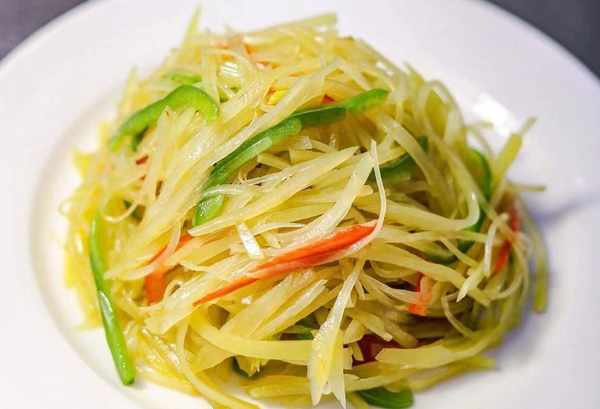 食材:土豆300克、青红椒各30克、食盐、味精、醋、香油、辣椒油(根据喜好添加)各适量