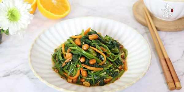 食材:菠菜、花生、红萝卜、姜末、盐、白糖、生抽、陈醋、辣椒油