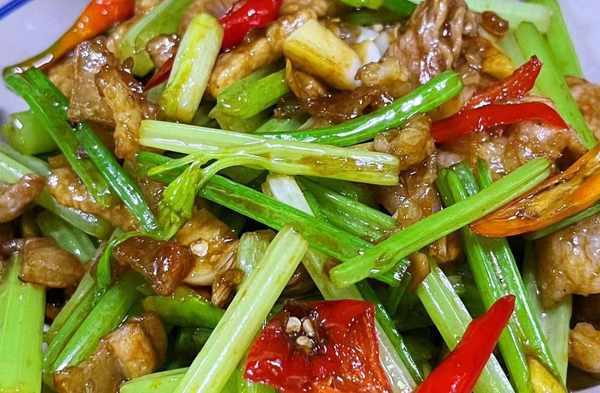 2、锅中放底油下肥肉煸出油脂,下瘦肉滑熟盛出备用,锅中留底油下姜蒜爆香,下芹菜翻炒断生,下辣椒炒香,加盐调味,下猪肉翻炒均匀,加味极鲜酱油蚝油翻炒入味即可。