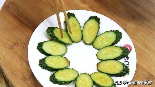 4.把腌制好的黄瓜片,摆放在盘中,如图中所示那样,放在盘中垫底,下面,给焯熟的里脊肉片调一下味。