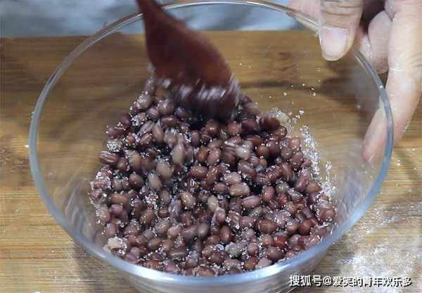 2.准备红豆半碗,已经提前泡软了,倒在蒸笼里面,上汽以后开始计时蒸15分钟,红豆蒸熟以后倒入盆中晾凉,晾凉以后放入一勺白糖,搅拌均匀备用。