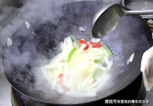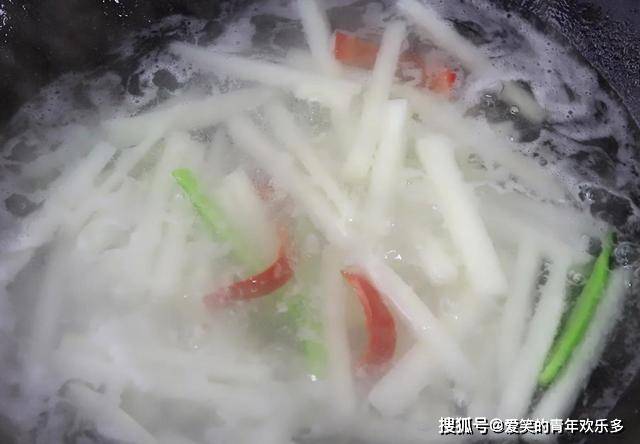 6.锅内烧水,水烧开以后,把肉丝倒入锅中,肉丝变色以后倒出来,控水备用。