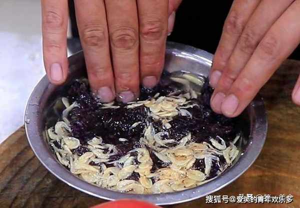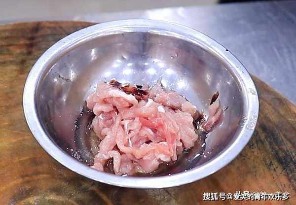 5.准备肉丝100克,加入少许食盐,倒入一点料酒去腥,少许老抽上色,用手抓匀腌制10分钟。