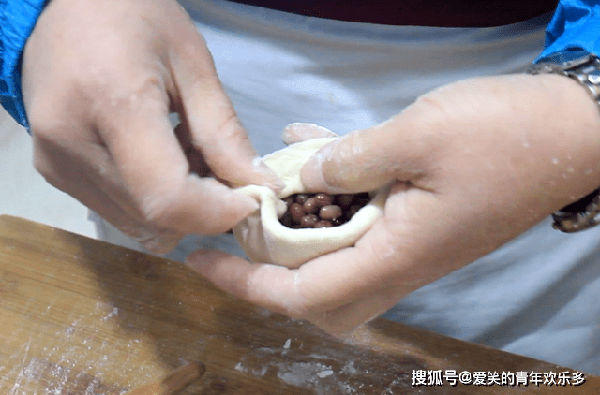 3.面团发酵好之后,在案板上撒上面粉,把面团拿出来多揉一会儿排排气,把面团搓成长条,分成6-8个面剂子,把面剂子揉圆再摁扁,擀成圆形的面片,在面片上挖入适量的红豆馅,像包包子那样把开口收紧。
