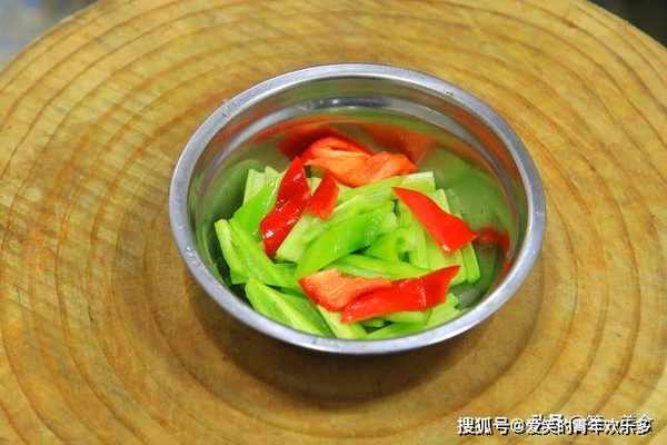 2.准备芹菜三根切成段,青椒半个切成菱形片,红椒半个同样切成菱形片,和芹菜放在一起,青红椒主要用来配色比较好看。