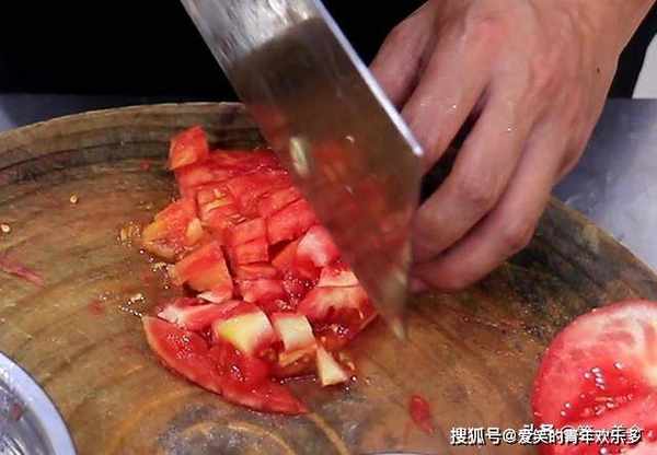 2.准备西红柿一个,清洗干净打上十字花刀,放入开水中烫一会儿,烫破皮以后,把外皮剥干净,切成番茄丁。