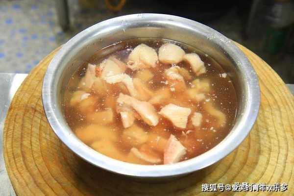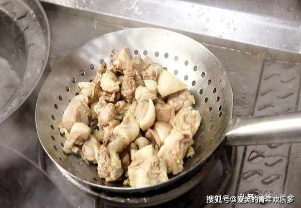 4.锅内烧水,把鸭块倒入笊篱中控干水分,加入少许食盐入底味,料酒10克去腥,把鸭块冷水放入锅中,轻轻推动让其均匀受热,鸭块冷水下锅,会慢慢的析出血水。水烧开以后打去锅中的浮沫,焯水2分钟左右捞出,用清水冲洗干净,控水备用,这一步主要是为了去除鸭块中的血水减少腥味。