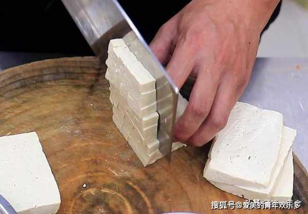 1.准备老豆腐一块,先切成厚片,再切成1厘米左右的豆腐丁。