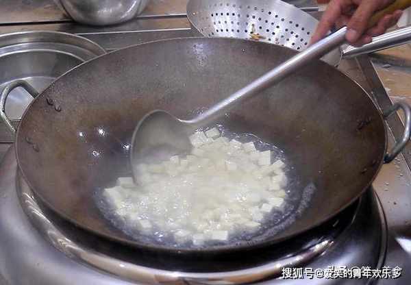 7.锅内再烧水,加入一勺食盐入底味,把豆腐倒入锅中,焯水1分钟左右倒出来,快速用清水冲洗一下,以免豆腐粘在一起,这一步主要是为了去除豆腥味。