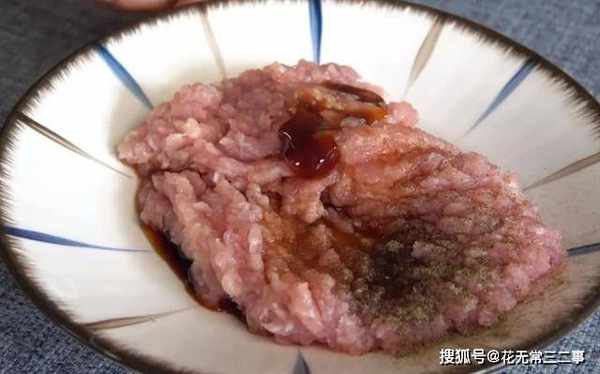 3、将猪肉切碎,放食盐、鸡精、耗油、生抽腌制入味。