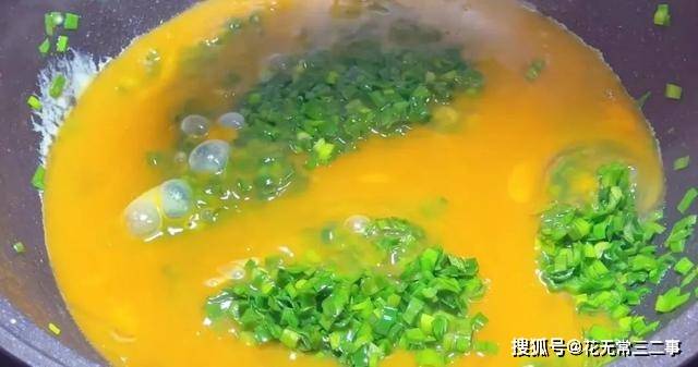 5、随后倒入蛋液,慢慢搅拌。