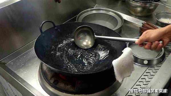 4.食材全部准备好以后,我们开始烹饪,锅内烧油,充分滑锅以后,倒出热油加入凉油,热锅凉油炒肉片时不易粘锅。